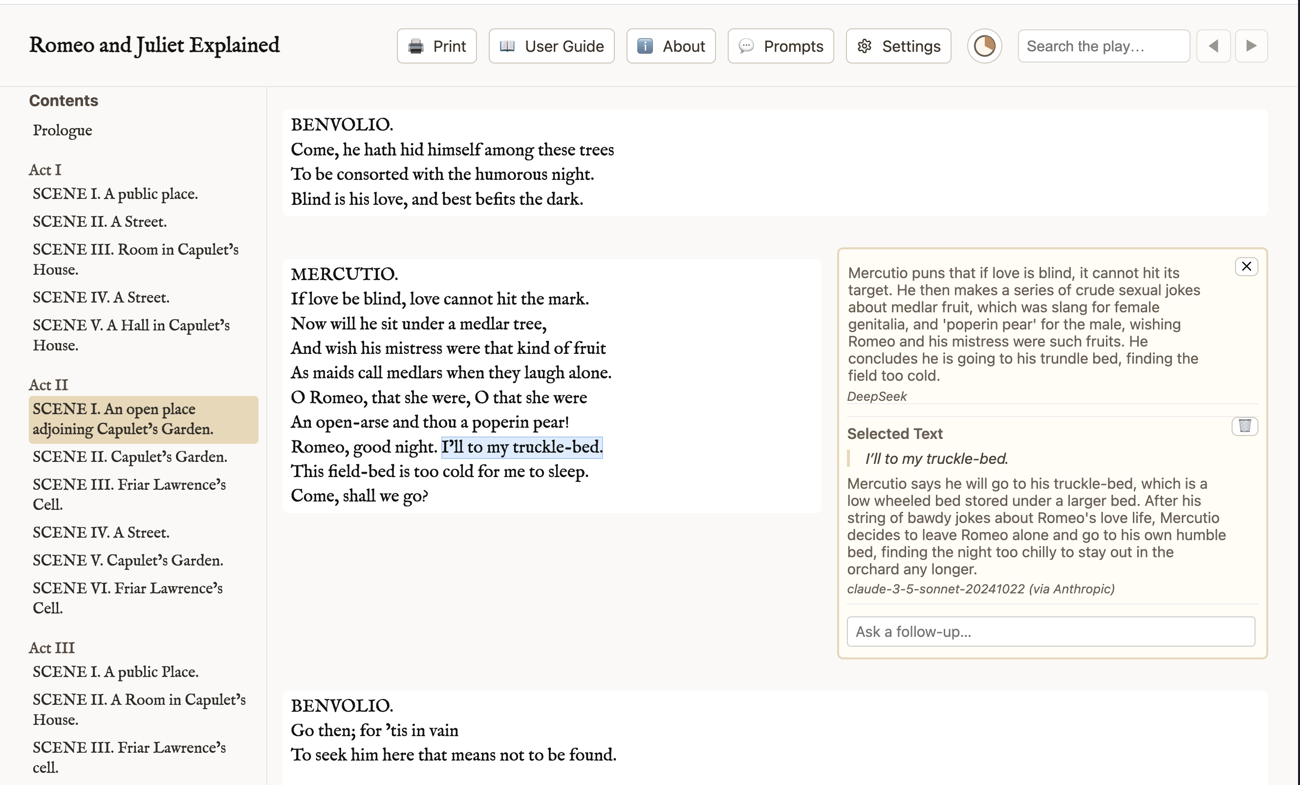 Romeo and Juliet Explained is an interactive digital tool designed to make Shakespeare's timeless tragedy more accessible to modern readers. By combining the original text with on-demand explanations, this project bridges the gap between Elizabethan English and contemporary understanding.